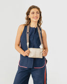 Strap: Detachable cotton crossbody strap in custom chevron stripe, adjustable to 140cm