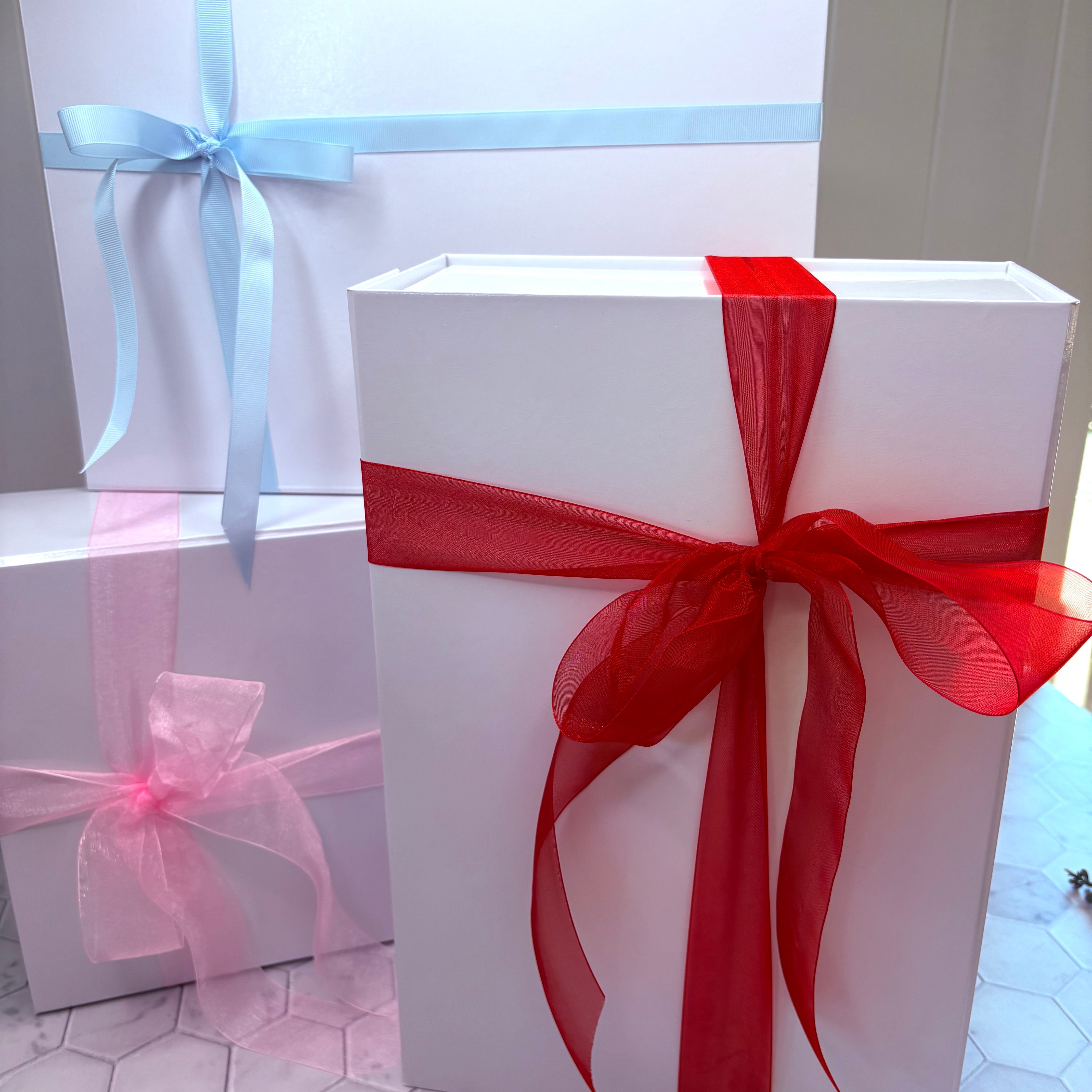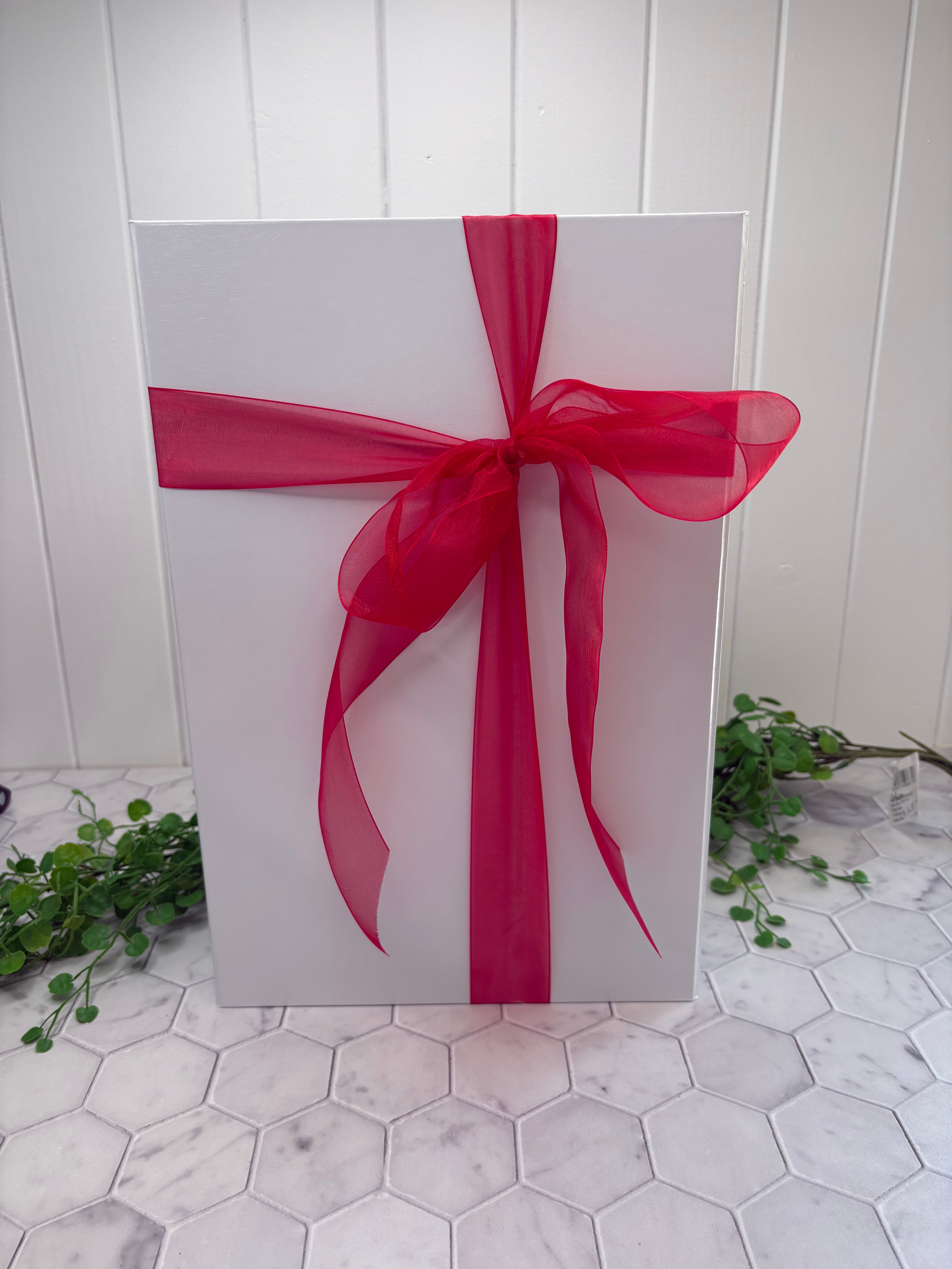 Beautifully crafted in white high gloss with a magnetic closure, wrapped in lush Ribbon to compliment your gift.