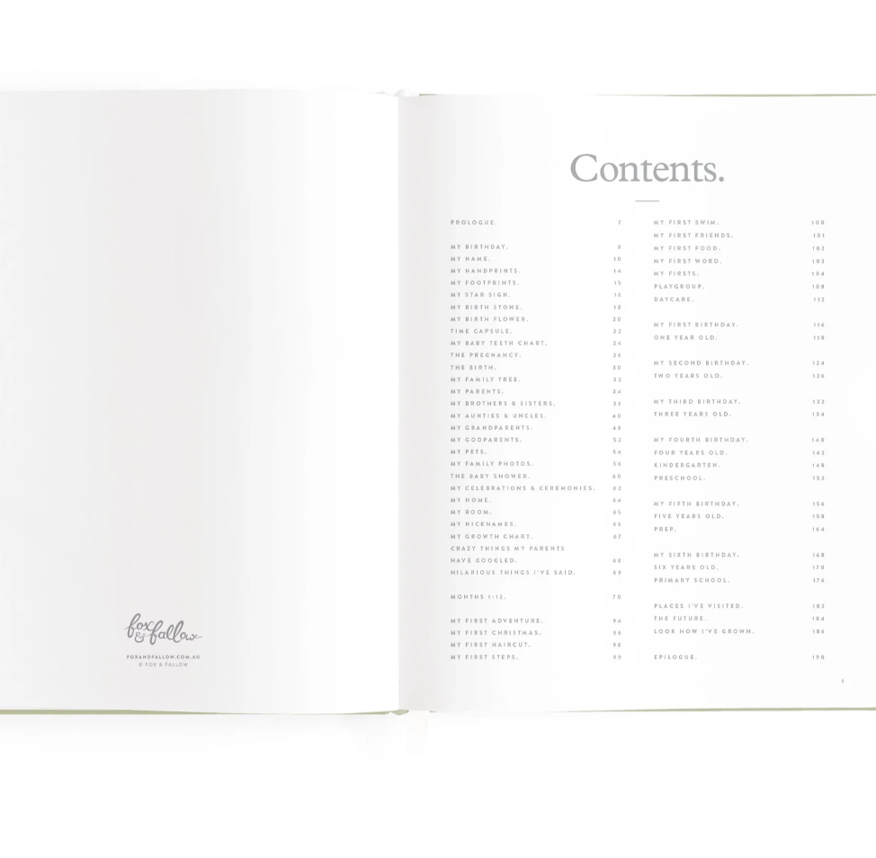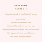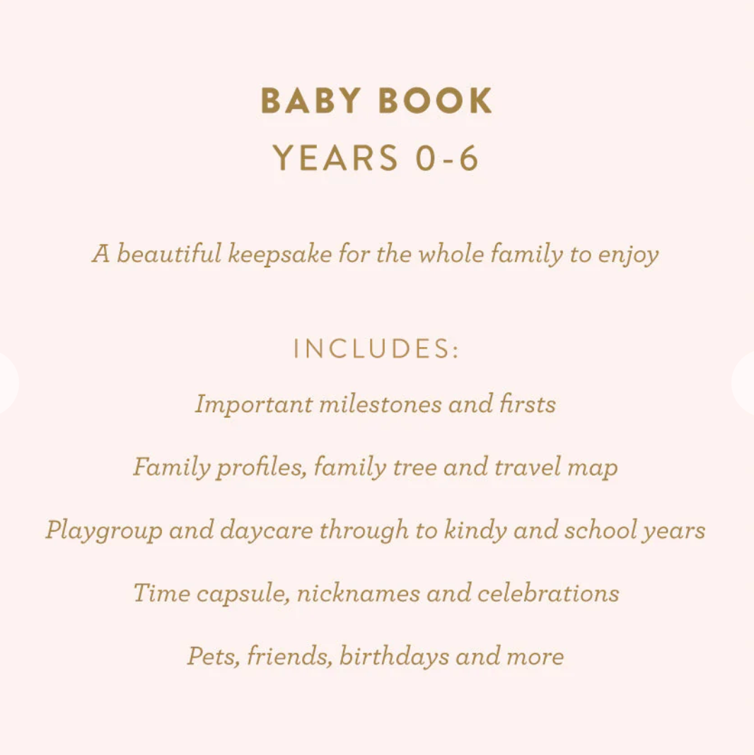A beautiful keepsake for the whole family to enjoy. Includes: important milestones and firsts, family profiles, family tree and travel map, playgroup and daycare through to kindy and school years, time capsule, nicknames and celebrations, pets, friends, birthdays and more. 190 pages.