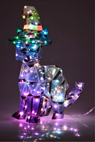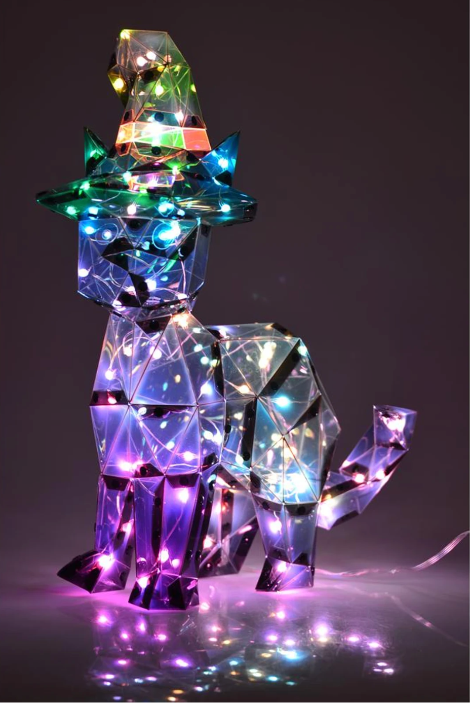 The reflective geometric body, made from an intricate web of folded acrylic panels, hides an array of dazzling LED lights. Includes customisable color options or flickering effects can all be controlled with an app on your phone! Simply scan the QR code on your lamp and connect via Bluetooth, to reveal a world of interactivity! USB Powered, the lamps can even flash in sync with your chosen music!!